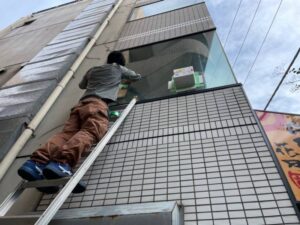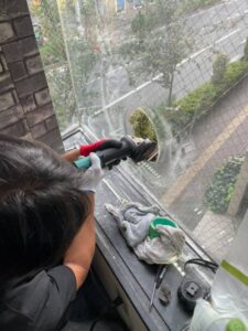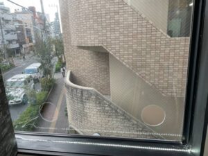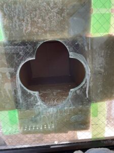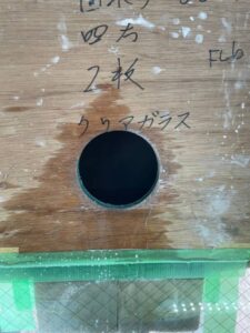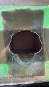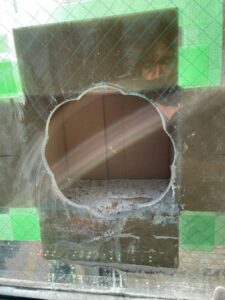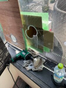 ダクト穴開け工事 投稿者: t-sone_admin2021年8月26日2021年11月04日施工実績 施工時期:2021年8月 導入場所:東京都世田谷区 コロナで換気がお店には必要の為ガラスに穴を開けてダクトを通す工事です。網入りの10ミリのガラスに200Φの穴を2箇所開けます。 外に飛ばないように養生します。 カップは200Φ無いので100Φを使用しました。最後にサンダーで凸凹削って完成です。